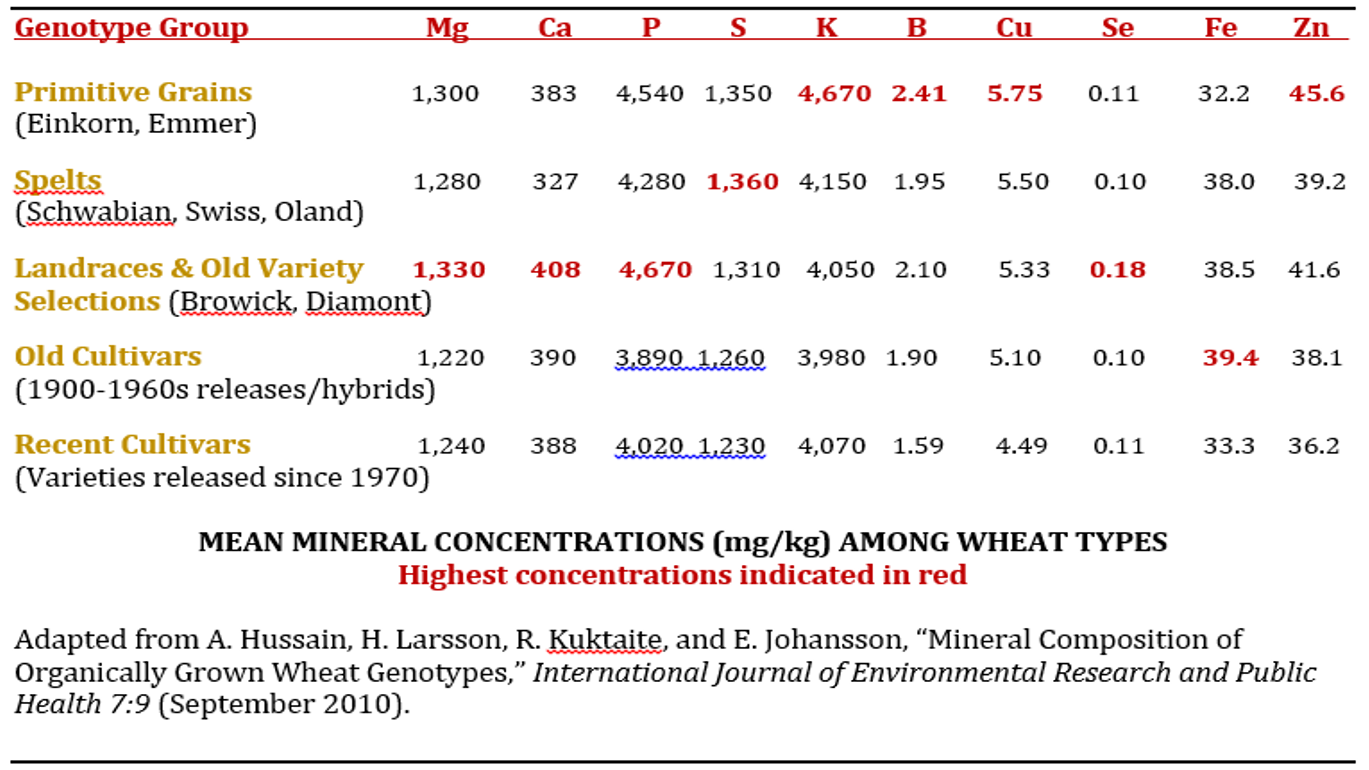 In recent studies at the Swedish University of Agricultural Sciences in Alarp, cereal researchers Abrar Hussain, Hans Larsson, Ramune Kuktaite, and Eva Johansson conducted chemical analysis using plasma mass and plasma atomic emission spectrometry on 321 spring and winter wheat genotypes. These were divided into six groups: primitive grains, spelts, landraces, old variety selections, old cultivars (1900-1960s releases/hybrids), and new cultivars (varieties released since 1970) to determine nutritional variations among the genotypes. (The researchers define old variety selections as wheats that have been selected for organic cultivation from such “old material” spelt, durum, and bread wheat breeding lines.)